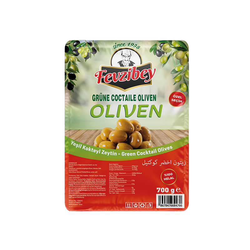 Ber-na Group Fevzibey güvencesiyle, Yeşil Kokteyl Zeytin özel vakumlu paketlerde satışa sunulmuştur. Fevzibey Yeşil Kokteyl Zeytin kahvaltıların vazgeçilmezlerindendir.