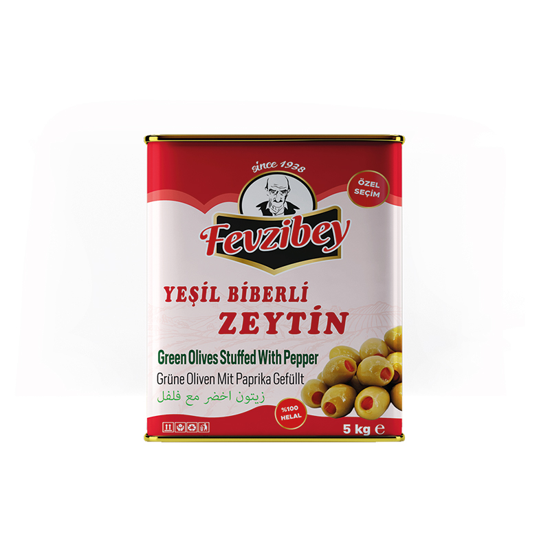 Ber-na Group Fevzibey güvencesiyle, Yeşil Biberli Zeytin tenekede satışa sunulmuştur.