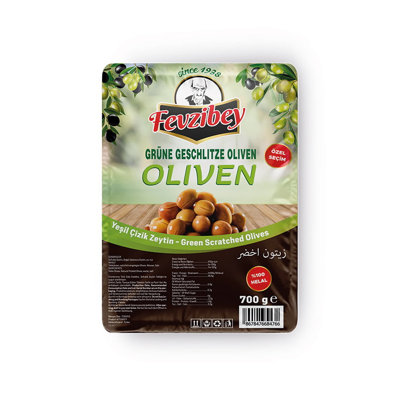 Hiçbir kimyasal kullanılmadan acılığı suda giderilerek ve tatlandırılarak üretilen Fevzibey Yeşil Çizik Zeytin kahvaltıların vazgeçilmezlerindendir.