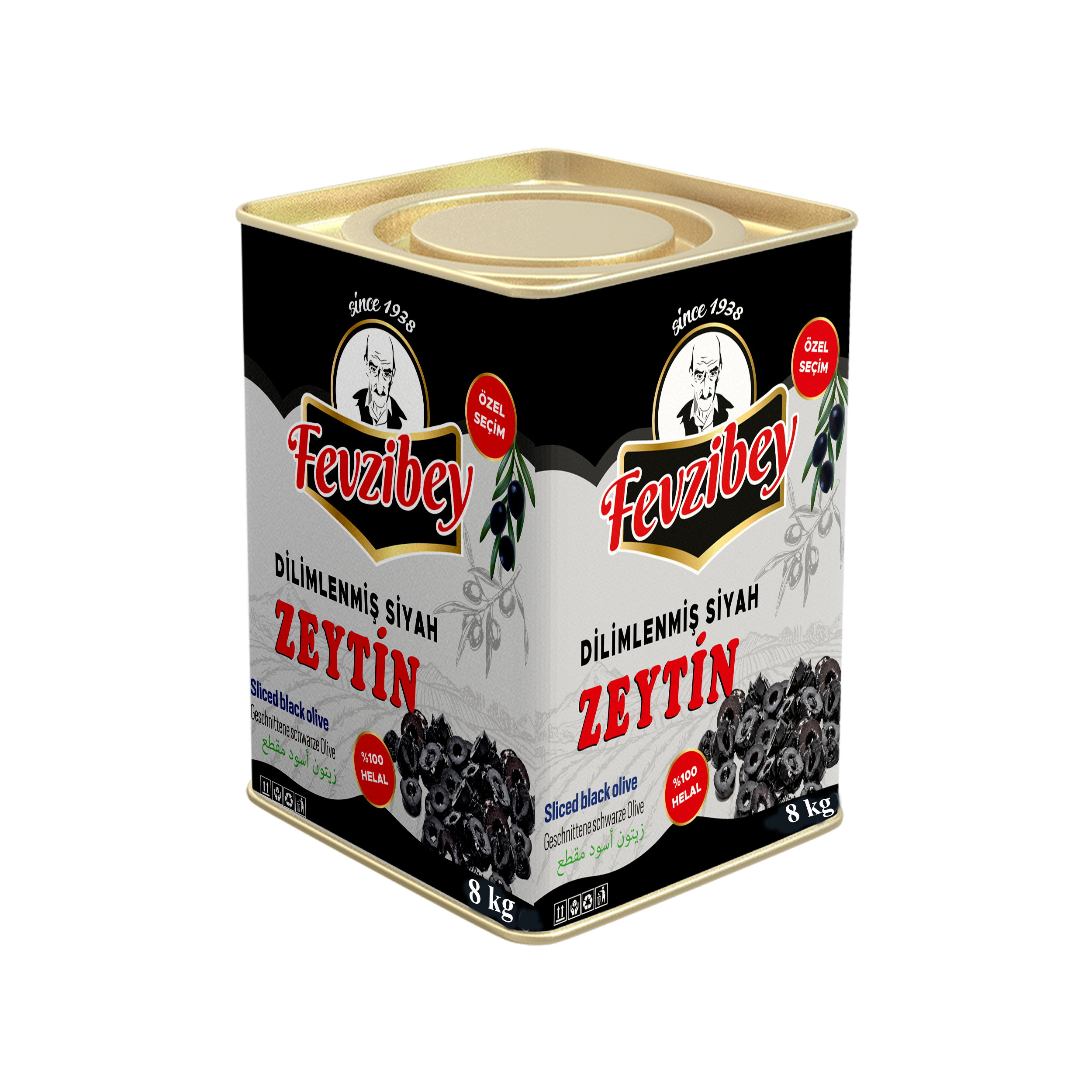Ber-na Group Fevzibey güvencesiyle, Dilimlenmiş Siyah Zeytin  8 kg tenekede satışa sunulmuştur. Fevzibey Dilimlenmiş Siyah Zeytin kahvaltıda, yemeklerde, salatalarda, soslarda, unlu mamullerde pizza ve sandviçlerde, doğrudan tüketilebilir.